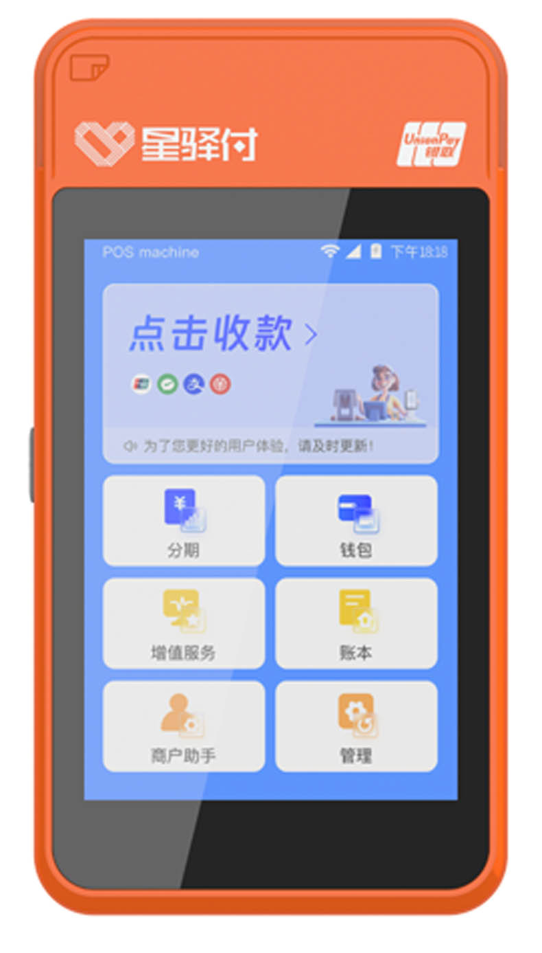 一、产品优势 1. 小巧便携 手机大小的体积,全触控彩屏设计,操作流畅不卡顿 2. 应用丰富 内置交易记录查询、消息通知等终端应用 支持会员营销、便民服务、金融增值等综合功能 3. 聚合收款 支持银行卡/微信/支付宝/云闪付等多种支付方式 支持刷卡/插卡/挥卡等传统支付 费率优惠:扫码0.38%、刷卡0.6% 使用教程 1. 基础操作 长按电源键启动 2. 收款功能 扫码收款:展示二维码或扫描客户付款码 刷卡收款:支持磁条卡/芯片卡/NFC支付 增值服务:手机充值、信用卡还款等便民功能 3. 账务管理 实时查看交易记录 自动生成电子对账单 支持预授权、分期付款等场景